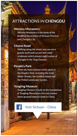 四川省旅游局全球社交媒体营销,主要目标国家包括:英国、美国、俄罗斯、加拿大、德国、法国、荷兰、澳大利亚、日本、新加坡、马来西亚等。内容包括Facebook, Instagram, Twitter, YouTube国际平台运营;符合欧美人群审美的视频制作及HTML5 Facebook版本开发。
